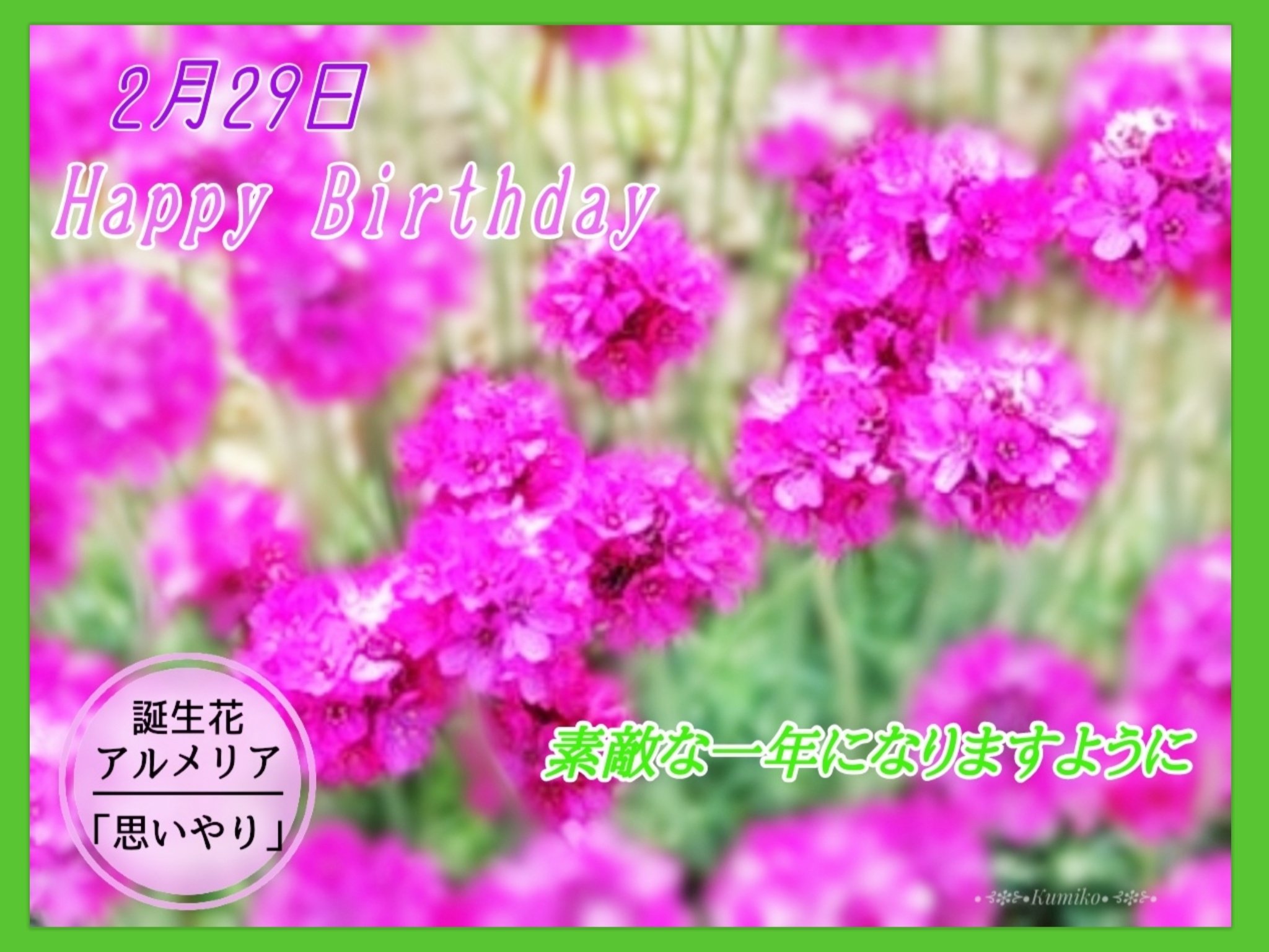 2月29日 勿忘草(ワスレナグサ) 「真実の愛」「私を忘れないで」 アルメリア 「同情」「思いやり」「共感」 2月1日~2月29日|誕生花と花言葉一覧のまとめ 中世のヨーロッパで 2月29日生まれさんの基本的な性格 相手を思いやることができ穏やか 真面目で一途な頑張り屋さん 2月29日生まれさんの恋愛 恋人にはわがままになる二面性がある2月29日生まれ 誕生花 ポーチュラカ 花言葉「無邪気」 無邪気 2度の脳梗塞で 右半身がいつも しびれている夫の 無邪気なふるまいと 本気のダジャレに ツッコミを入れる私 たまにスルーをすると 寂